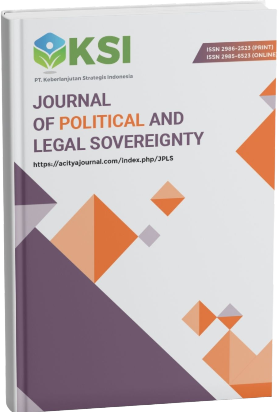 Journal of Political And Legal Sovereignty (abbreviated as JPLS) published by PT Keberlanjutan Strategis Indonesia, p-ISSN 2986-2523 and e-ISSN 2985-6523. The Journal of Political And Legal Sovereignty is has published in four (4) issues per year and published in January – March, April – June, July – September, October – December. Journal of Political And Legal Sovereignty also uses the LOCKSS system to ensure a secure and permanent archive for the journal. Since 2024. Journal of Political And Legal Sovereignty member of CrossRef. Therefore, each article will own a DOI (Digital Object Identifier) number 10.38142/jpls, Web of Science and other indexing, see Abstract and Indexing.